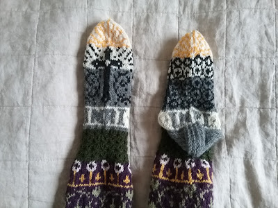 Nyt taitaa yhteineulonnat jäädä vähäksi aikaa tauolle. Somessa on ainakin kolme sukan neulontaa nytkin menossa. Nyt on mielessä muutama muu työ. Ja huomenna on mentävä puikkokauppaan kun on tarve 120cm pitkälle nelosen pyöröpuikolle.